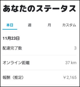 正直に言うと、日曜日にしては注文の鳴り(リクエストの頻度)が少し弱い、「閑散期かな?」と感じる一日でした。それでも、時給換算すれば1,656円。これは決して悪い数字ではありません。